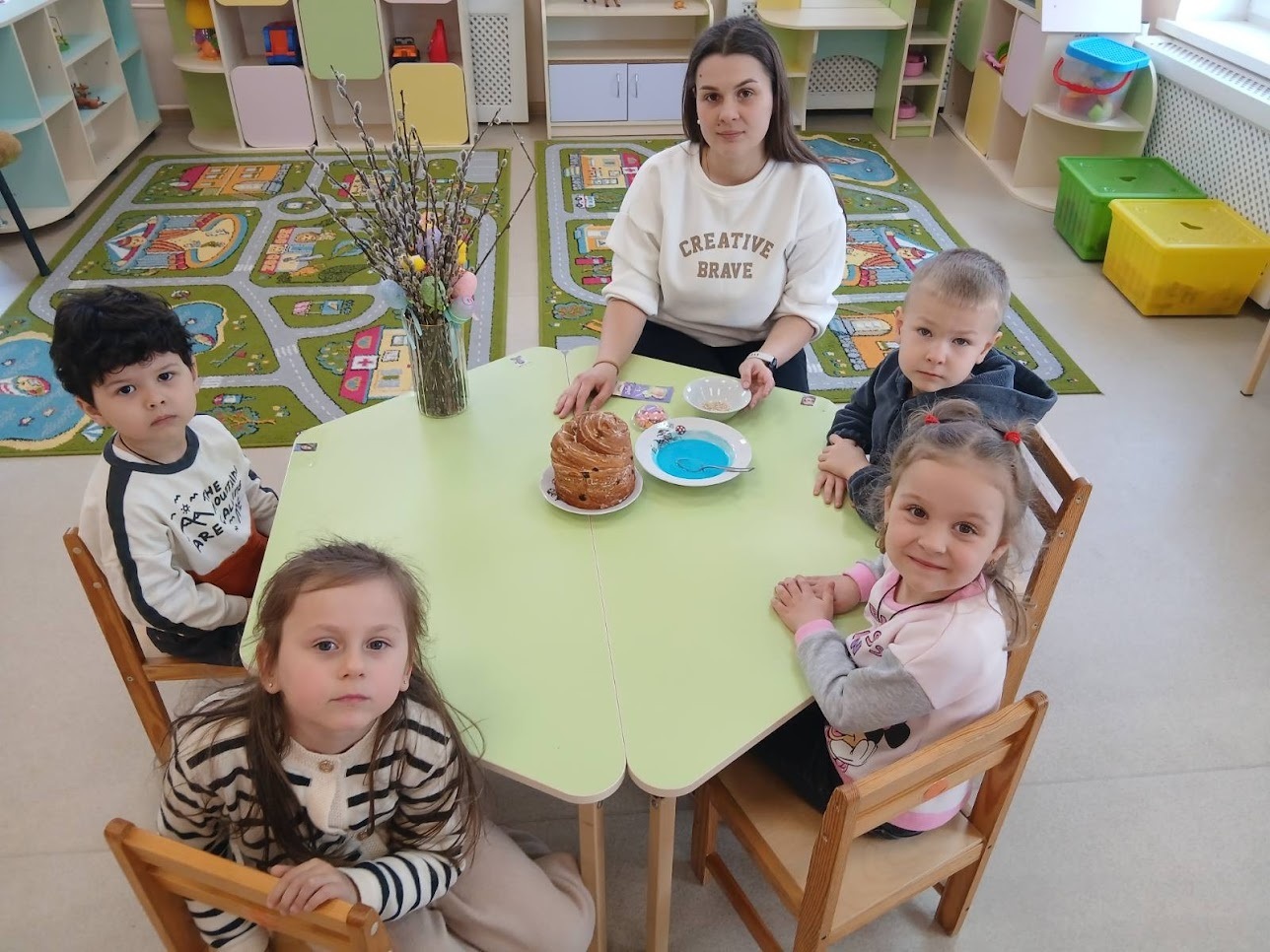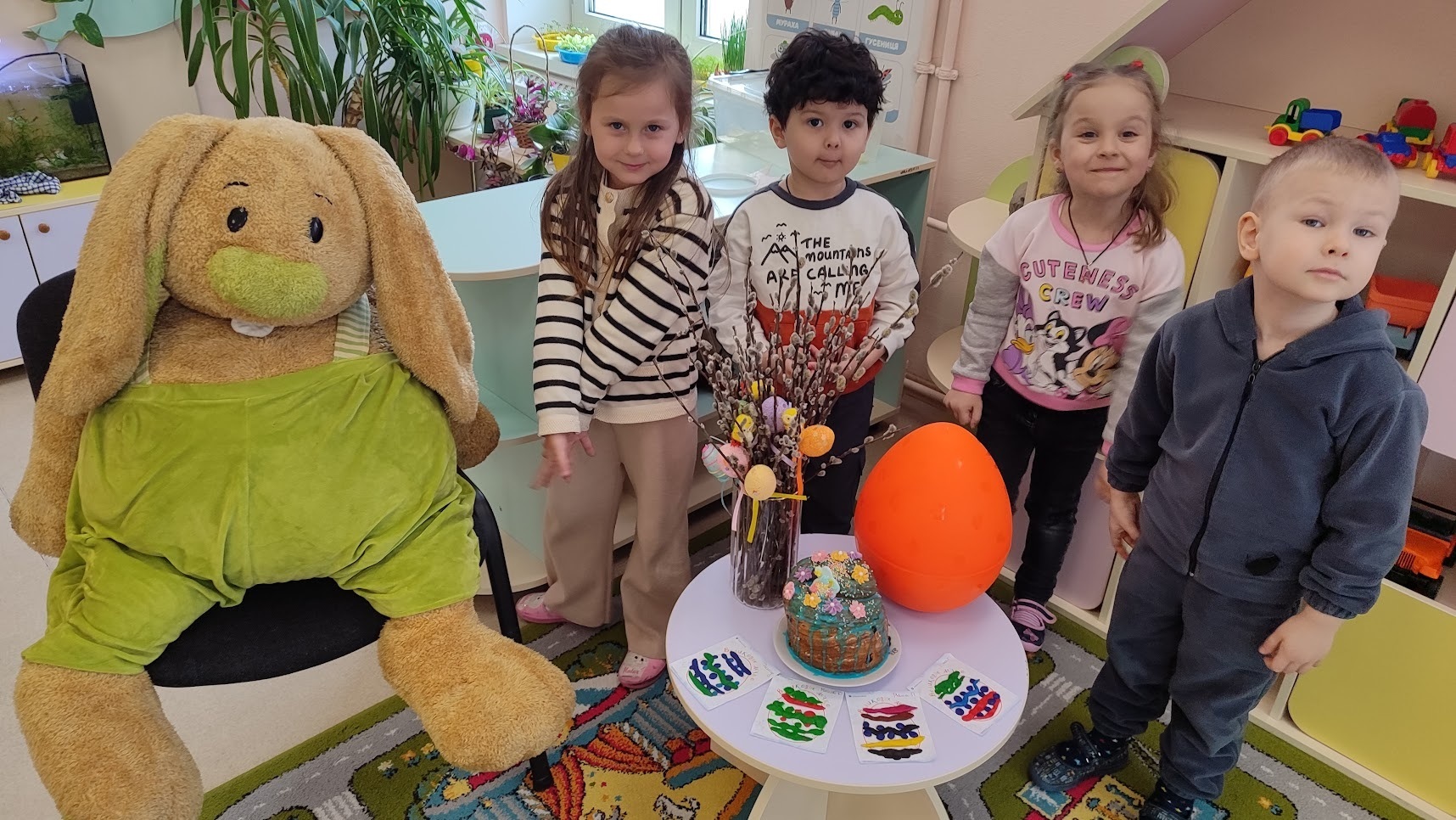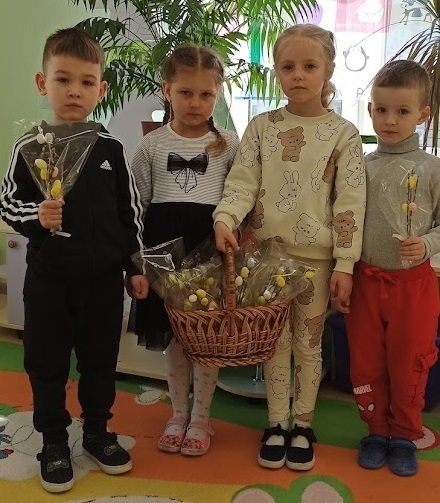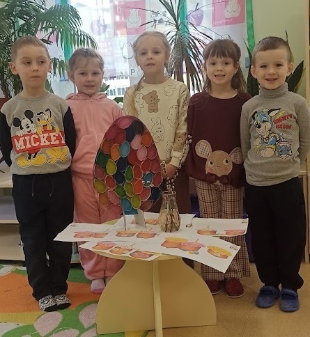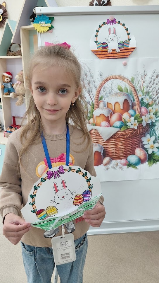 Не менш захопливо готувалися до свята і в групі «Розумники» разом із вихователями Поліною Коломієць та Світланою Самохатньою. Тут вихованці занурилися у світ флористики, створюючи ніжні великодні букети з вербових гілочок. Маленькі майстри виготовляли паперові пасочки з яскравою аплікацією, а справжнім символом єдності групи стала велика об’ємна писанка – спільний проєкт, над яким працювали всі малята разом, навчаючись відчувати красу, створену спільними зусиллями.