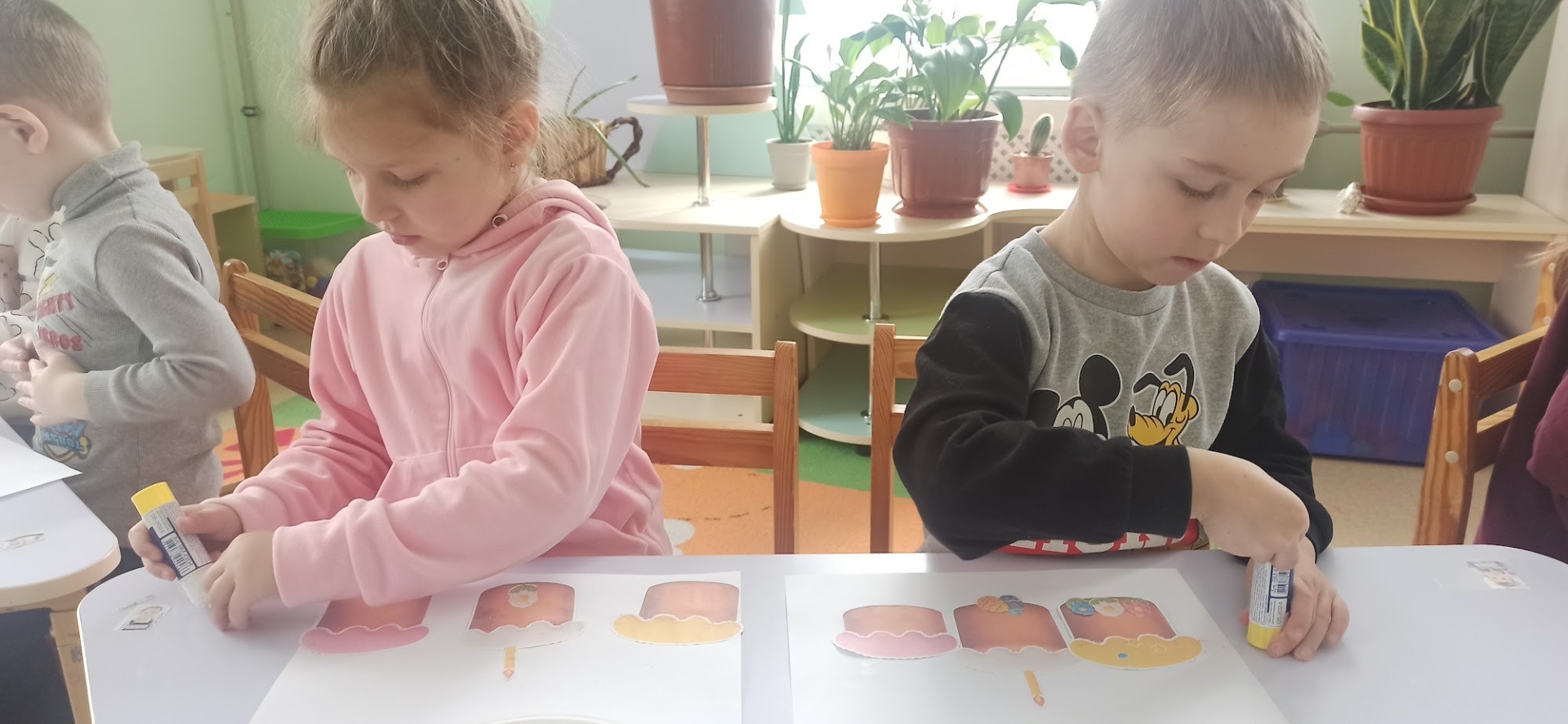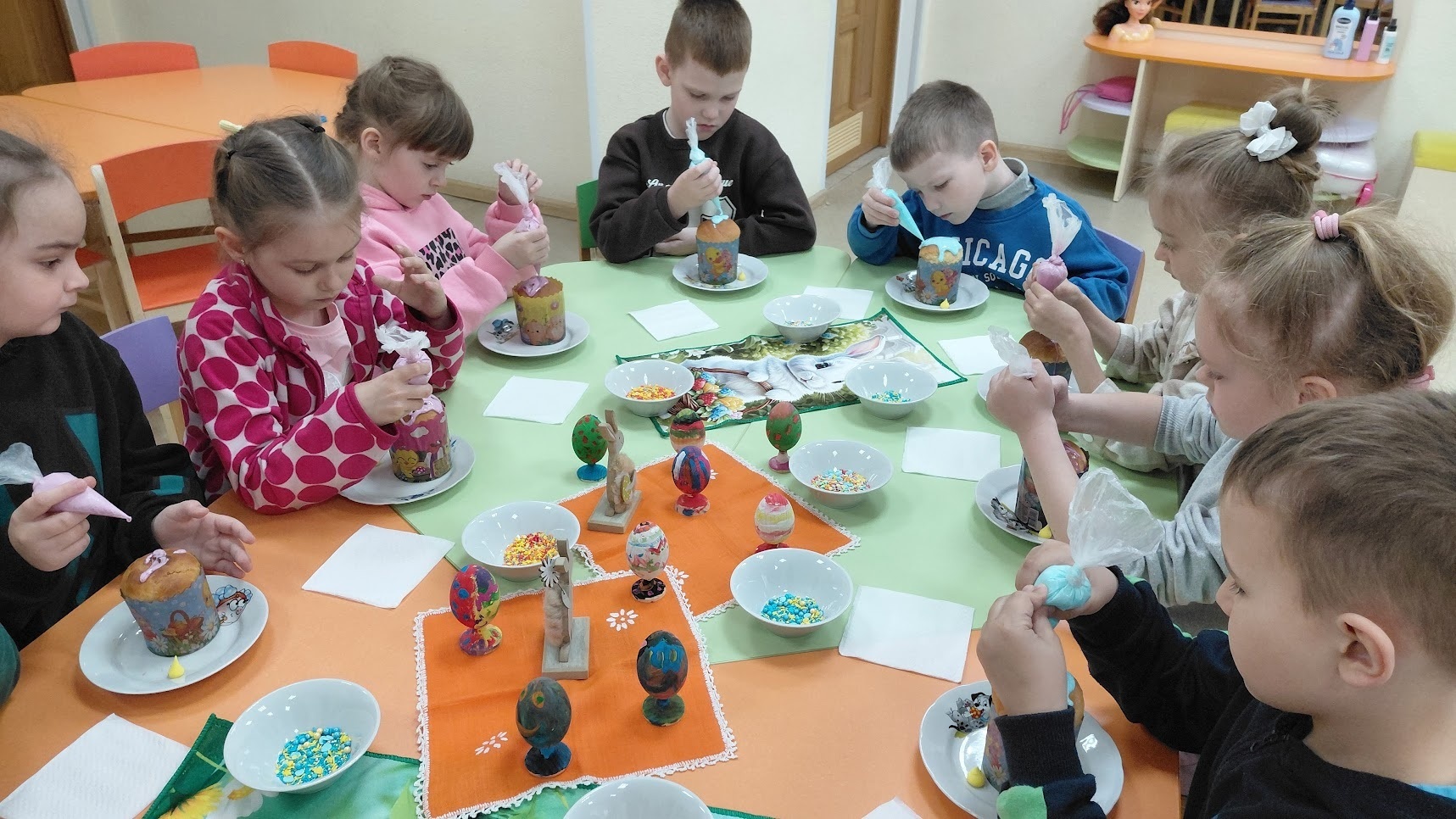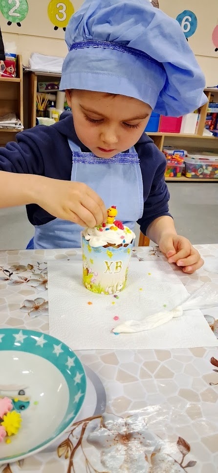 Старші вихованці з групи «Зірочки» разом із вихователями Анною Какарека та Наталією Кузьмичовою також стали маленькими кулінарами. Діти з великим задоволенням власноруч прикрашали пасочки, проявляючи неабияку фантазію та старанність. Протягом тижня вони вивчали значення кожного продукту у великодньому кошику, вчилися тонкощам розпису на дерев’яних писанках та створювали креативні об’ємні аплікації з великодніми кроликами. Кожен день для них став відкриттям, наповненим новими знаннями про духовне значення свята та важливість збереження культурної спадщини.