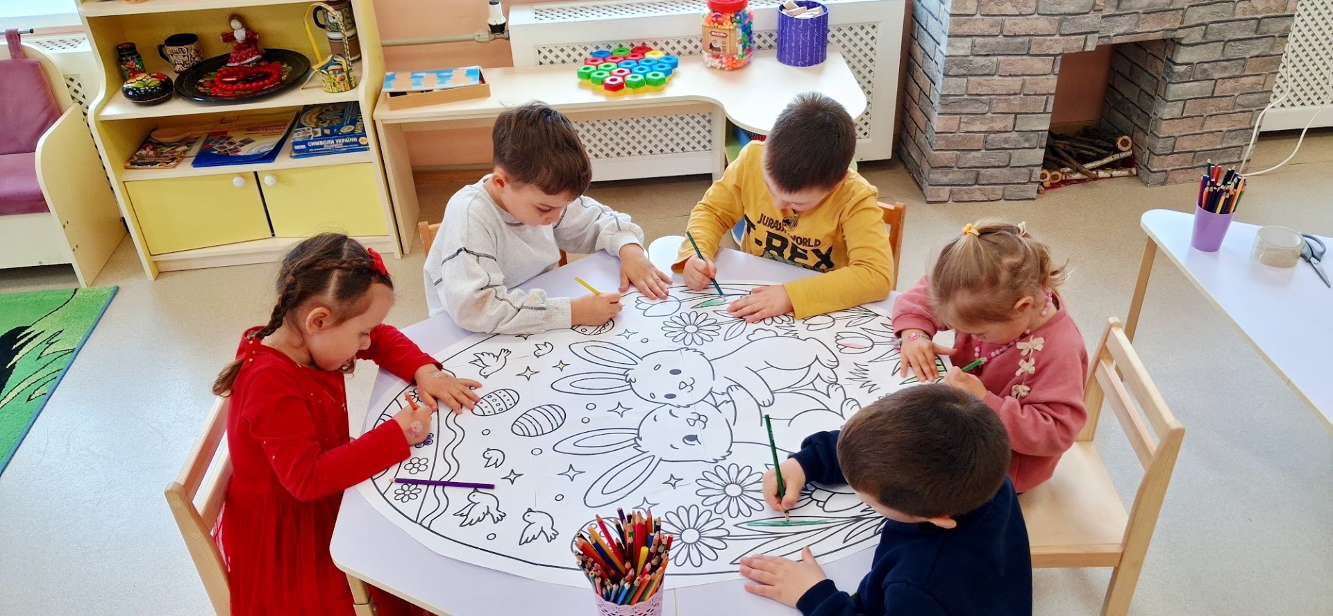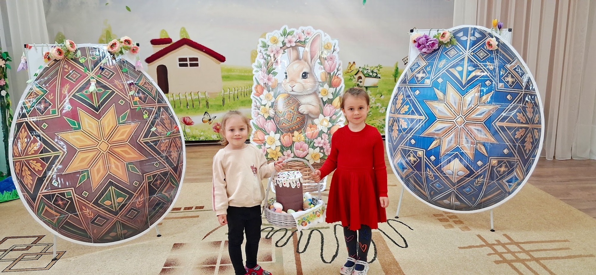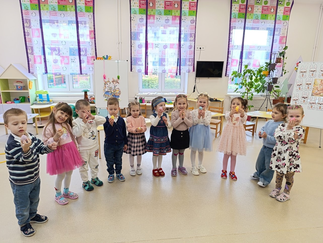 Неймовірний масштаб підготовки продемонструвала група «Знайки» під керівництвом вихователів Олени Лам та Анни Толстик. Малята не лише спробували себе у ролі кулінарів, а й створили справжню алею писанок-велетнів, які за зростом були навіть вищими за самих вихованців! Ця велична виставка разом із яскравими великодніми розмальовками стала головною окрасою закладу. А завдяки сюжетно-рольовій грі «Кухарі» діти повністю занурилися у святкові клопоти, імітуючи випікання великоднього хліба.