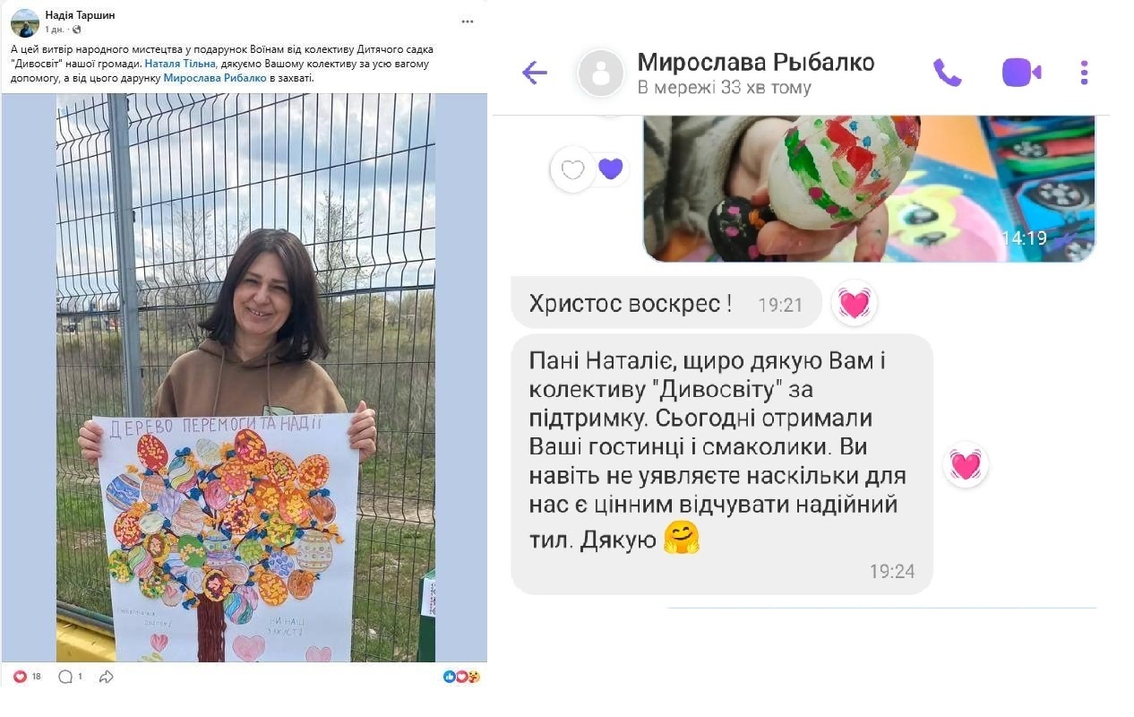 Маленькі майстри наполегливо працювали над створенням патріотичних поробок та оберегів, вірячи, що кожен виріб, зроблений власними руками, стане надійним захистом для воїнів на передовій. Зокрема, вихованці групи старшого дошкільного віку «Мрійники» створили особливе «Дерево перемоги та надії», вклавши у кожну його гілочку віру в мирне майбутнє нашої країни. Окрім корисних речей та творчих дарунків, діти групи середнього дошкільного віку «Знайки» та групи старшого дошкільного віку «Зірочки» підготували відеопривітання, у яких зворушливо дякували героям за можливість вчитися, гратися та мріяти під рідним небом.